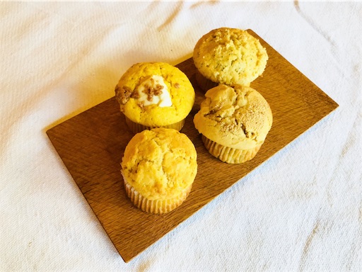 マフィン4個セット(プレーン・かぼちゃ&クリームチーズシナモンクランブル・国産レモンのレモンカードクランブル・ピーナッツバター&煮りんご)1300円です。